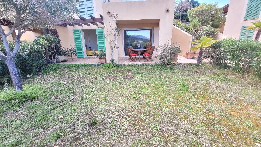 Dans une résidence avec piscine, bel appartement avec vue mer, composé d'une cuisine équipée ouverte sur le salon salle à manger, une chambre avec placard mural, un bureau avec placard mural, une salle d'eau, une cour extérieure avec placard de rangement et une terrasse couverte avec petit jardin.
